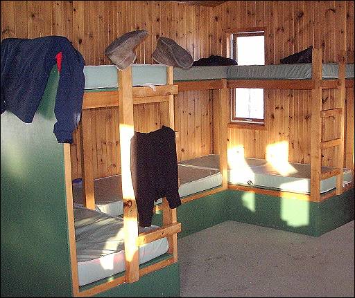 Inside the Lusk Cabin. It has two picnic tables and room to sleep six.