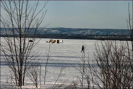 Ice fishing cabins on the Ottawa River are visible from this trial.